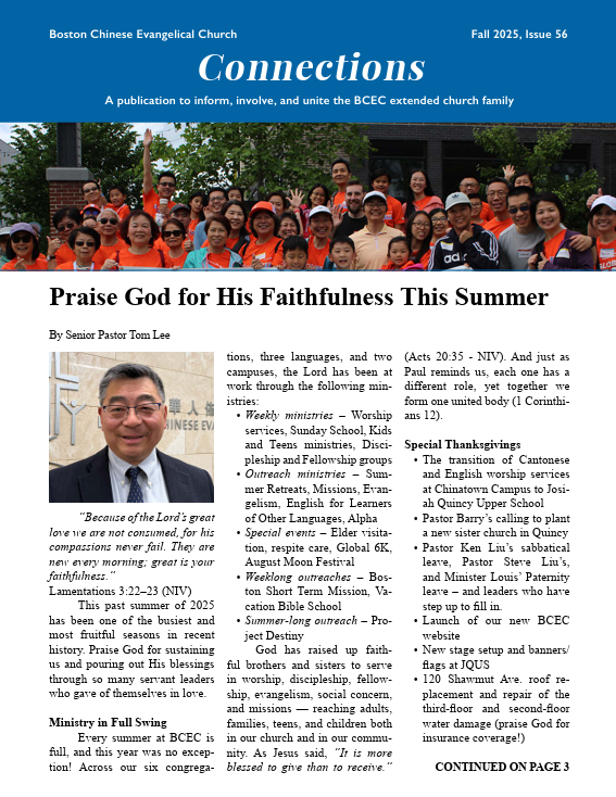 2025 BCEC Town Hall will be held in person at the Josiah Quincy Upper School (900 Washington Street, Boston, MA 02111, Auditorium) and live-streamed two-way to Newton Campus (218 Walnut Street, Sanctuary) on Sunday, October 19, 1:15-3:00pm. It will be held in English with Cantonese and Mandarin translation. We encourage our BCEC members to attend the Town Hall to become fully informed about the FY25-26 General Fund, Mission Fund, Charity Fund and Expansion Fund budgets. In addition, the draft of the FY24-25 Financial Report will be presented. Light refreshments (baos) will be provided.